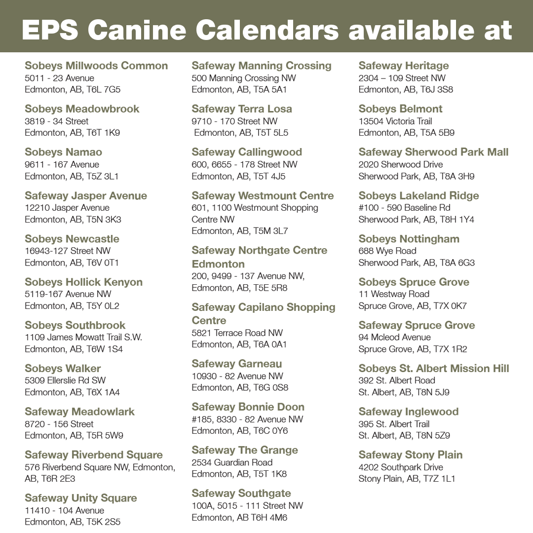 You can buy the EPS canine calendar at select Safeway and Sobeys locations in the Edmonton area.