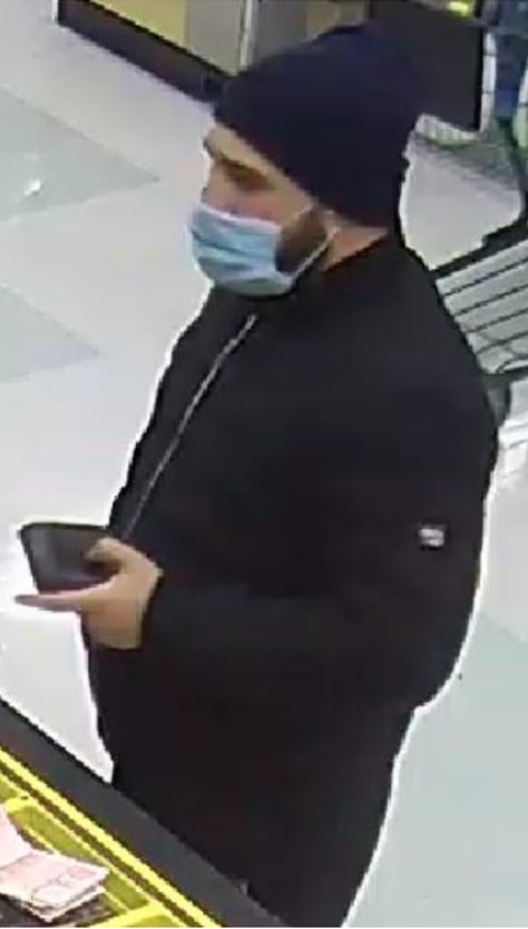He is described as a white male with a short, scruffy beard. He has been seen wearing a medical mask, a black baseball cap or dark-coloured toque, a black jacket with a large silver zipper, dark jeans and black shoes with white soles. The suspect often has an earbud in his left ear.