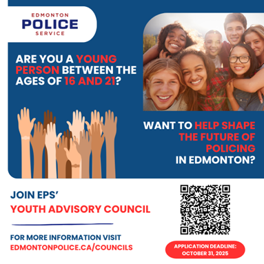 Are you a young person between the ages of 16 and 21? Are you interested in sharing your voice to advise and provide guidance to the Edmonton Police Service, reflecting the experiences of young people in Edmonton?