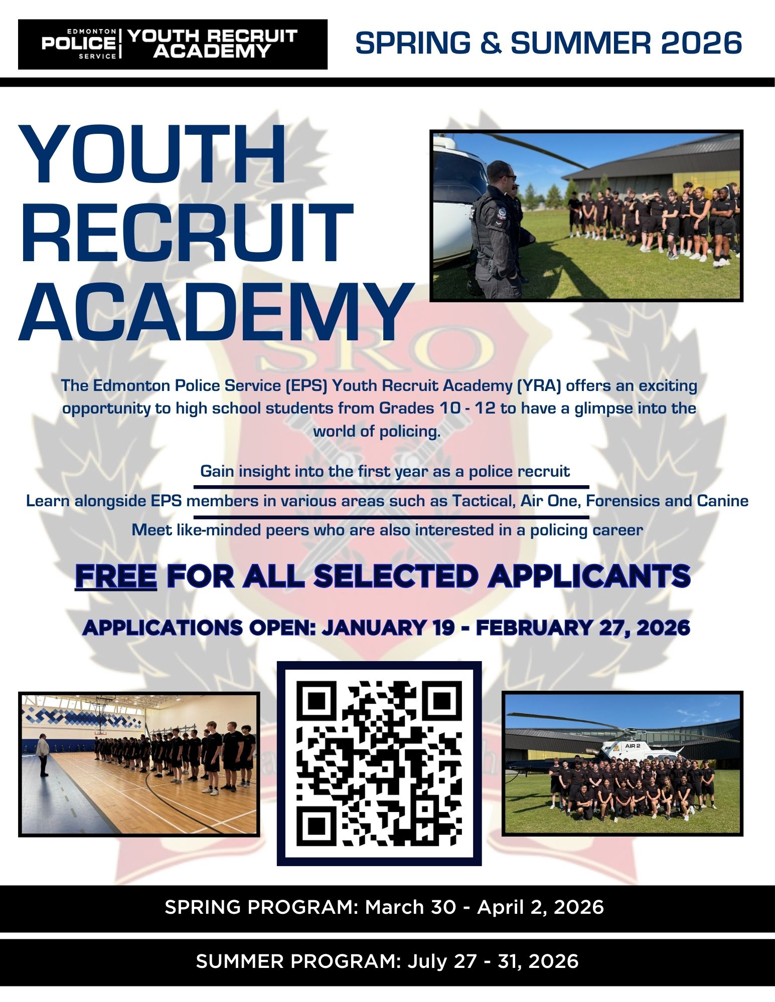 The Edmonton Police Service’s (EPS) Youth Recruit Academy (YRA) offers high school students in Grades 10, 11 or 12 interested in, or learning more about, a career in policing a small look into what it takes to fill the boots of an EPS recruit constable.