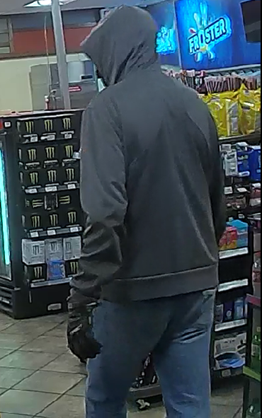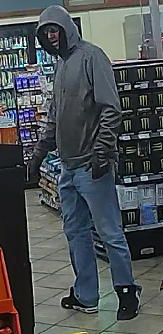 The unknown male suspect was captured on surveillance cameras, and investigators are hoping someone will recognize him. He is described as approximately 35 to 45 years old, 6’ tall with a slim build and no facial hair. The male was last seen wearing a grey hoodie, black sunglasses, blue jeans, black gloves and black and white sneakers, as pictured below.