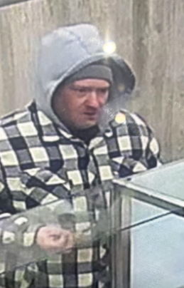 He is described as a white male, 5’8” to 5’10” tall with a medium build who was wearing black pants, a black and white checkered jacket, a grey hooded sweatshirt and black runners with white and red soles.