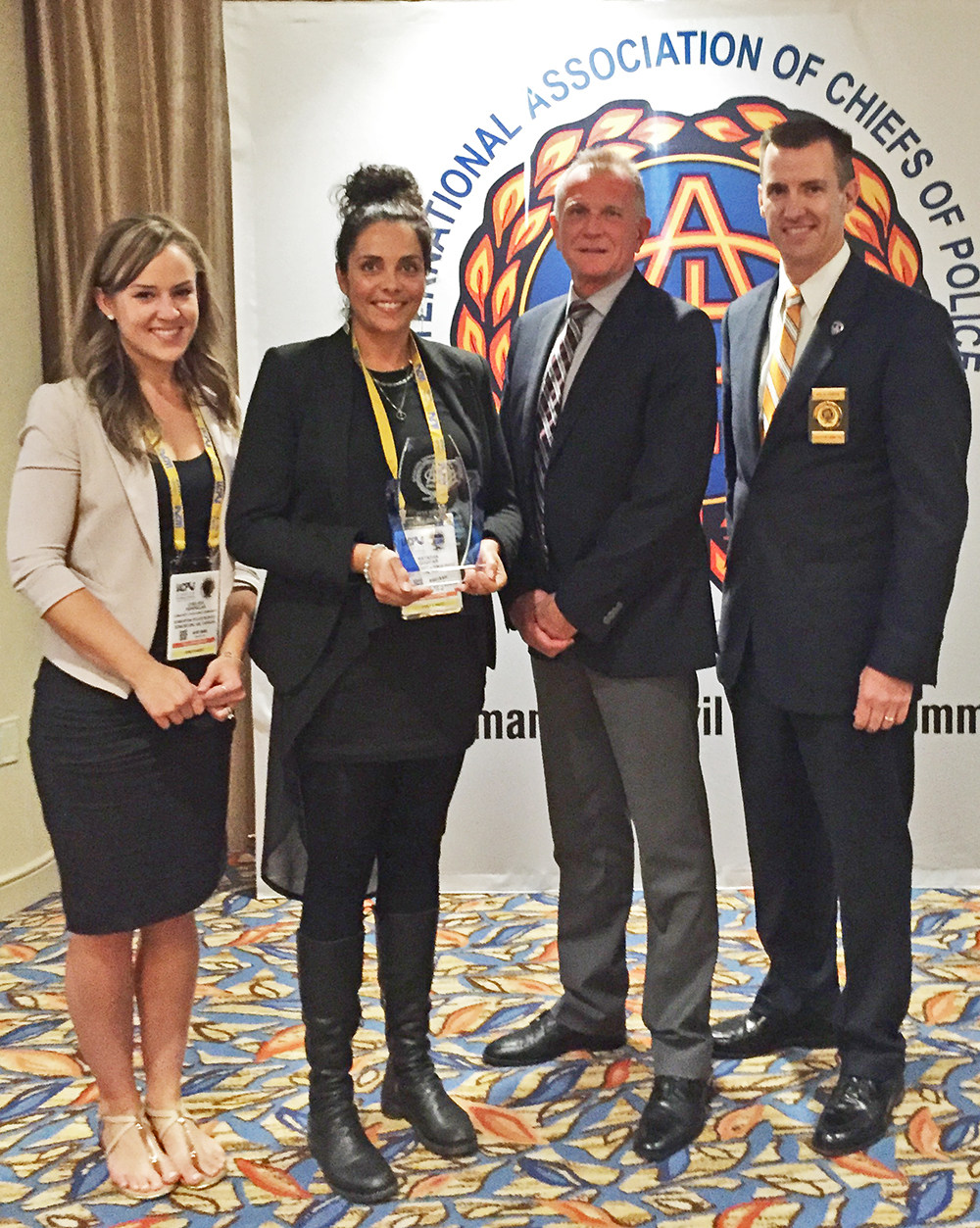 Photo: Chelsea Hawrelak, Natasha Goudar and Chief Rod Knecht accept the International Association of Chiefs of Police Human and Civil Rights Award with Will Johnson, Chief of Police of Arlington, Texas, and Chair of the IACP awards selection committee.